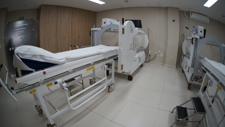 Durante o tratamento, você permanece deitado com conforto dentro de uma câmara hiperbárica monoplace Oxy, um equipamento moderno e seguro, onde respira oxigênio puro em alta concentração.